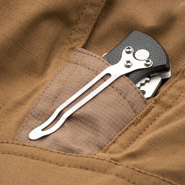 Les pantalons sont faits d'un matériau lisse et léger avec une imprégnation en téflon qui protège contre l'eau et la saleté. Le mélange de polyester et de coton est agréable sur la peau, conserve bien la couleur et est très résistant. L'idée principale lors de la création de ces pantalons était de maintenir le confort de mouvement - les concepteurs ont parfaitement maîtrisé cette tâche - les pantalons donne une impression de légèreté, ne limite pas les mouvements et a l'air élégant et solide. Le modèle a des poches confortables et larges avec des inserts renforcés. Le pantalon est conçu pour être porté avec une ceinture jusqu'à 5,5 cm de large. Des accessoires YKK de haute qualité ont été utilisés.