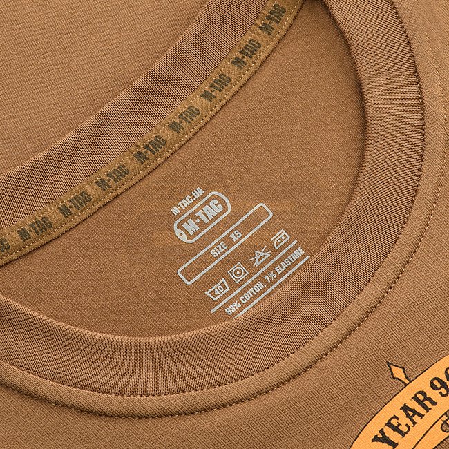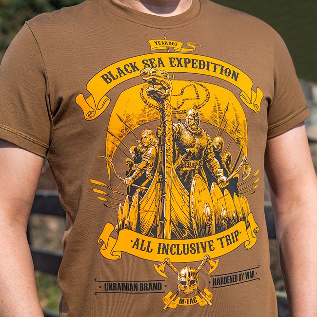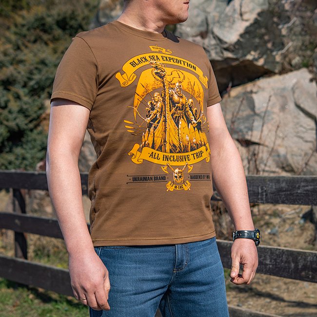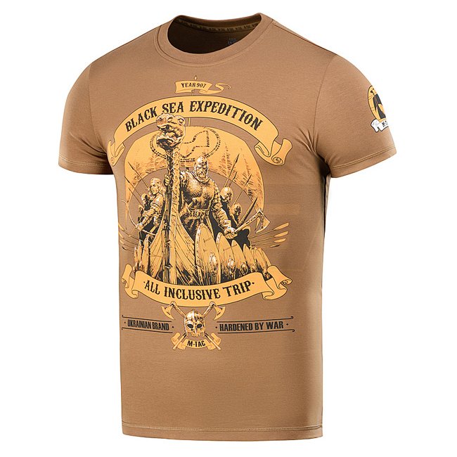Un t-shirt polyvalent M-Tac Black Sea Expedition en couleur coyote, taille XS, fabriqué à partir de 93 % de coton et 7 % d'élasthanne pour le confort et la durabilité. Parfait pour les aventures en plein air.