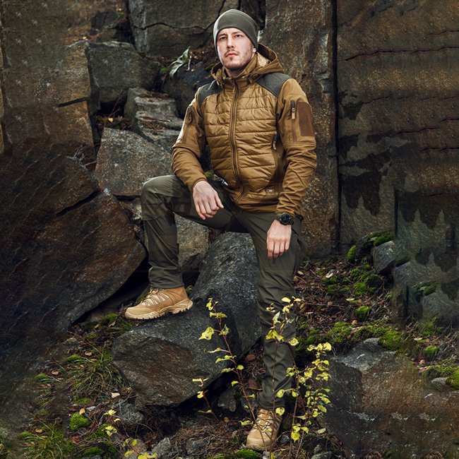 Les caractéristiques de conception du pantalon Conquistador Flex sont un insert élastique à la taille et près des poches latérales, grâce auquel le pantalon ne vous limite pas lorsque vous vous penchez ou vous penchez. Ils n'entravent pas la liberté de mouvement et vous pouvez les porter aussi bien comme vêtements tactiques que comme vêtements de tous les jours. Le pantalon a une fermeture éclair et un bouton, il est également équipé de passants pour une ceinture jusqu'à 5,5 cm de large. Deux anneaux en D sont cousus à l'avant pour attacher divers équipements. Le pantalon Conquistador Flex est équipé d'un grand nombre de poches, à la fois utilitaires et spéciales : il y a huit poches au total. Les poches latérales standard sont équipées d'un renfort en bas - pour attacher un clip de couteau ou une lampe de poche au bord de la poche. La poche cargo complexe est équipée d'une poche plaquée supplémentaire, qui peut accueillir un chargeur M4 ou AK. La poche cargo elle-même est assez spacieuse. Il a deux plis, grâce auxquels sa taille peut être augmentée pour transporter des objets volumineux. La poche cargo est fermée par un rabat velcro asymétrique à ouverture rapide. De plus, la poche cargo est équipée d'une deuxième entrée zippée, ce qui vous permet d'accéder à son contenu depuis une position assise.