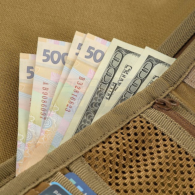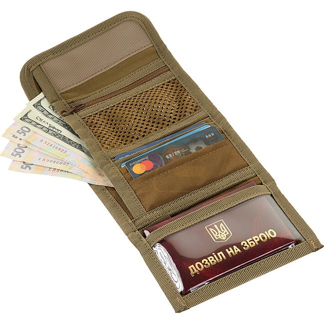 Il a deux grands compartiments pour les billets, des compartiments pour les cartes et des compartiments en plastique pour les documents. Il y a aussi une poche pour la monnaie, qui se ferme avec une fermeture éclair. Le panneau velcro avant vous permet d'attacher divers patchs.