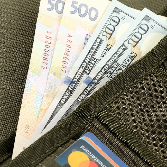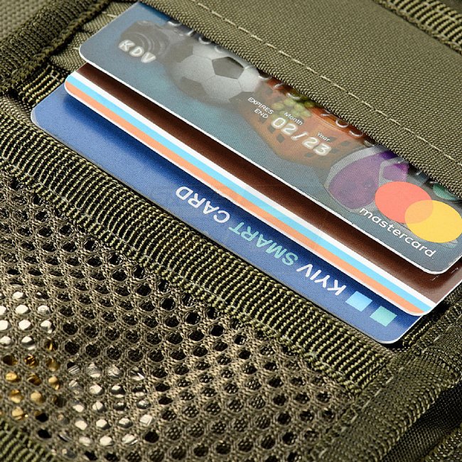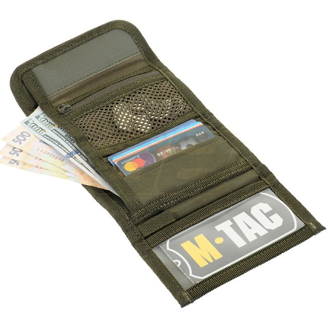 Il a deux grands compartiments pour les billets, des compartiments pour les cartes et des compartiments en plastique pour les documents. Il y a aussi une poche pour la monnaie, qui se ferme avec une fermeture éclair. Le panneau velcro avant vous permet d'attacher divers patchs.