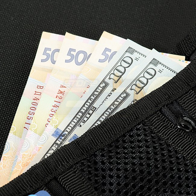Il a deux grands compartiments pour les billets, des compartiments pour les cartes et des compartiments en plastique pour les documents. Il y a aussi une poche pour la monnaie, qui se ferme avec une fermeture éclair. Le panneau velcro avant vous permet d'attacher divers patchs.