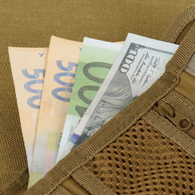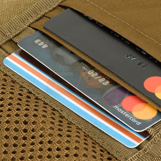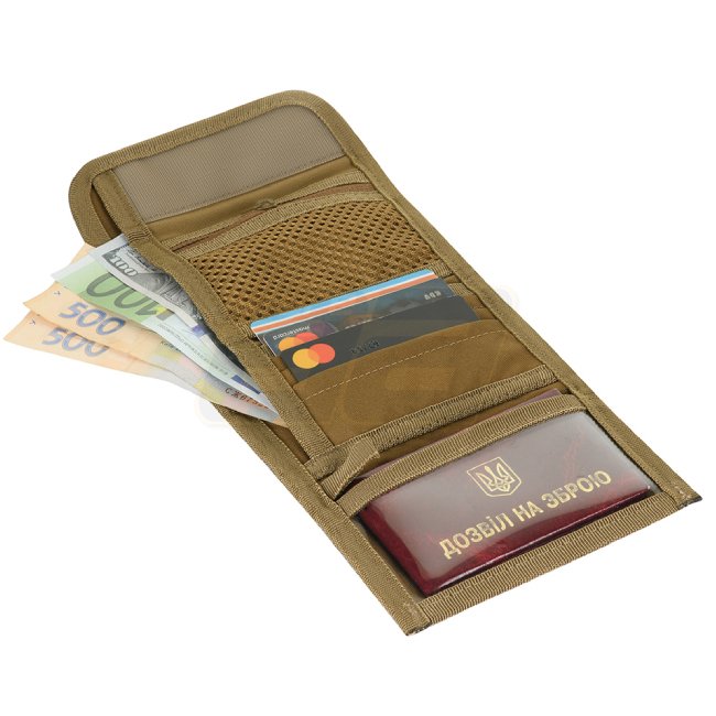 Le portefeuille Velcro M-Tac Elite Gen.II Hex - Coyote est un portefeuille robuste fabriqué en tissu Cordura et Oxford. Il comporte plusieurs compartiments pour de l'argent, des cartes et des documents, y compris une poche zippée pour la monnaie. Panneau