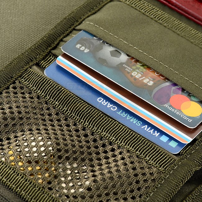 Il a deux grands compartiments pour les billets, des compartiments pour les cartes et des compartiments en plastique pour les documents. Il y a aussi une poche pour la monnaie, qui se ferme avec une fermeture éclair. Le panneau velcro avant vous permet d'attacher divers patchs.