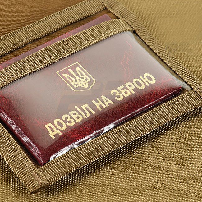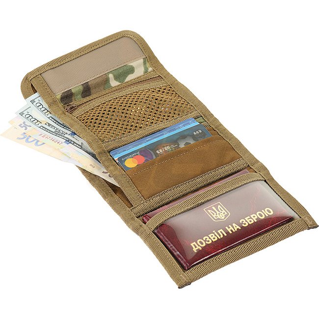 Il a deux grands compartiments pour les billets, des compartiments pour les cartes et des compartiments en plastique pour les documents. Il y a aussi une poche pour la monnaie, qui se ferme avec une fermeture éclair. Le panneau velcro avant vous permet d'attacher divers patchs.