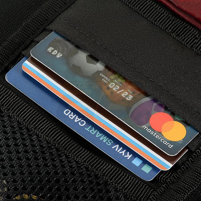 Il a deux grands compartiments pour les billets, des compartiments pour les cartes et des compartiments en plastique pour les documents. Il y a aussi une poche pour la monnaie, qui se ferme avec une fermeture éclair. Le panneau velcro avant vous permet d'attacher divers patchs.
