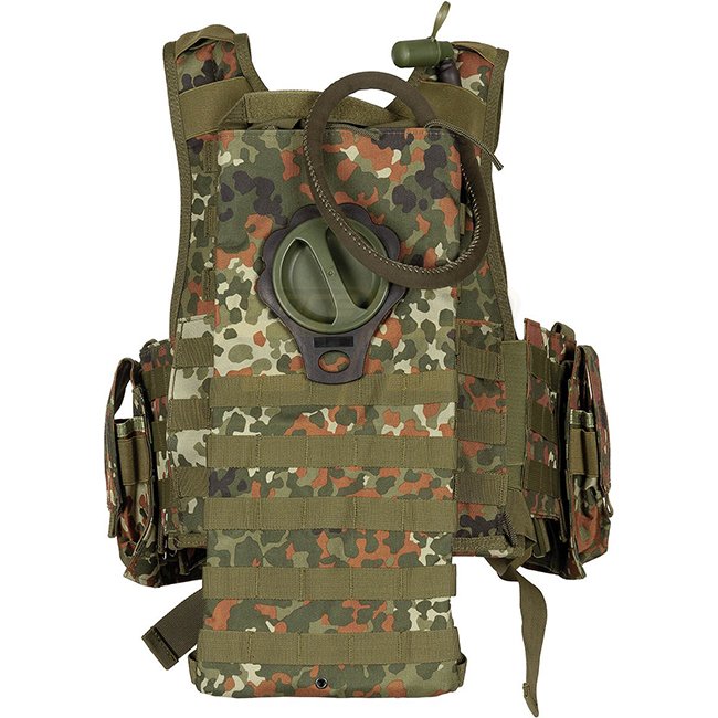 Gilet tactique avec système d'hydratation intégré et ajustement réglable, présentant diverses pochettes pour munitions et composants détachables pour une utilisation polyvalente. Fabriqué en 100 % polyester. Le système de boucles Molle offre des options d