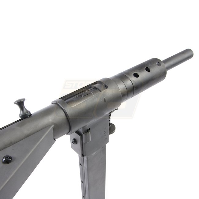 Fusil à gaz à culasse mobile STEN MK2 de haute qualité - Version Long Branch 1943 fabriqué en acier durable avec une capacité de chargeur de 32 coups (6mm). Caractéristiques d'une longueur de 750 mm, pesant 3280 g. Livré avec une longueur de canon interne