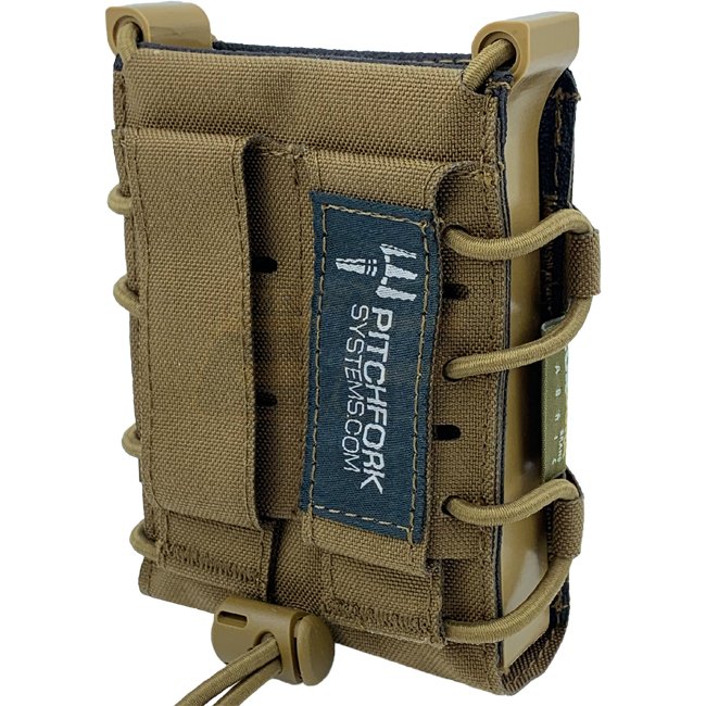 Pochette simple pour chargeur de fusil Pitchfork FLEX - Coyote : Côtés flexibles pour contenir divers chargeurs de fusil tels que AR15, AK47, SIG55x, G36, & plus. Résistance de tirage ajustable avec un arrêt de cordon. Doublure antidérapante pour une meil