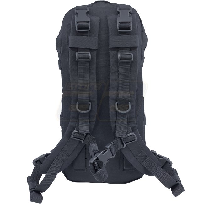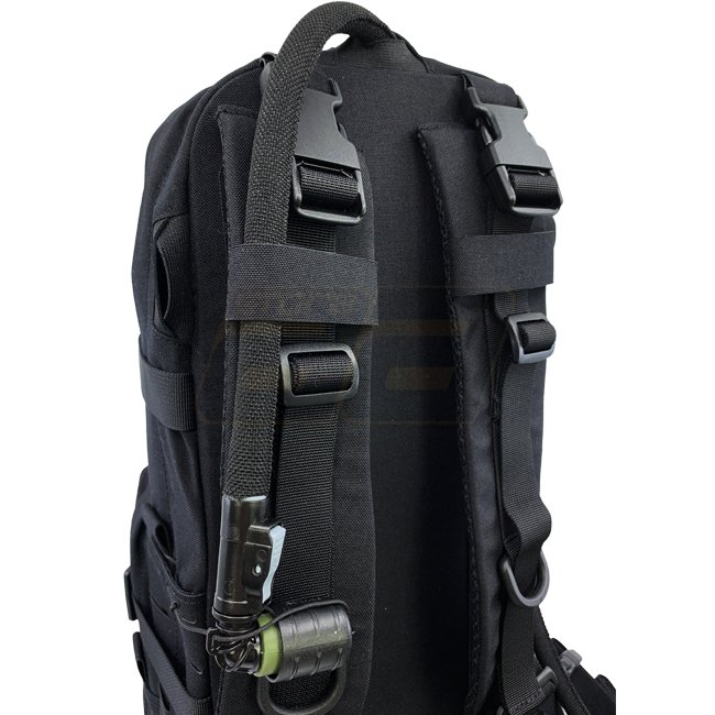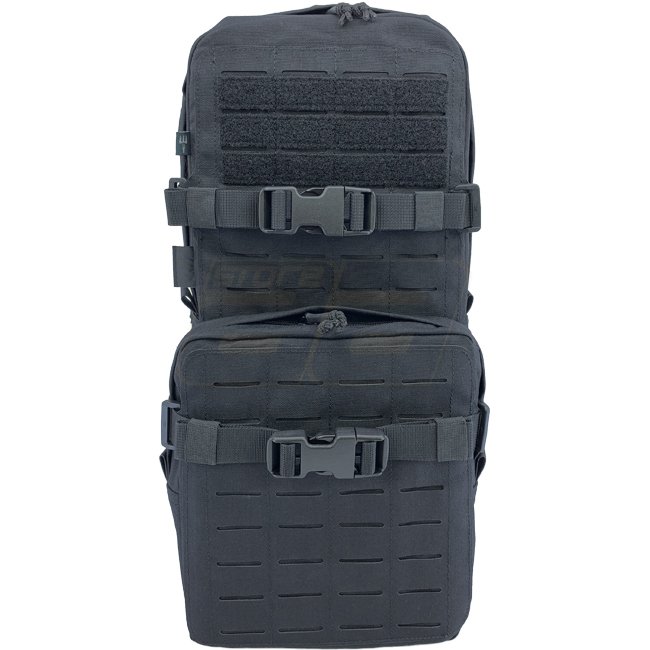 Recouvert d'une surface laminée LaserCut sur trois côtés ainsi que de zones velcro pour les patches d'identification et de moral, il comporte des compartiments longs et minces à chaque côté. Ils peuvent contenir des antennes, des câbles, des chargeurs ou des outils nécessaires. Les compartiments sont ensuite recouverts de surfaces LaserCut pour fixer des poches supplementaires à base de MOLLE.