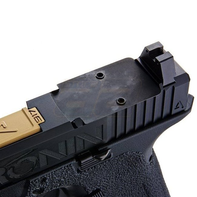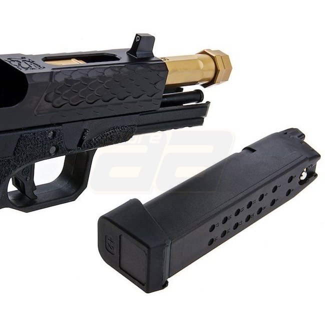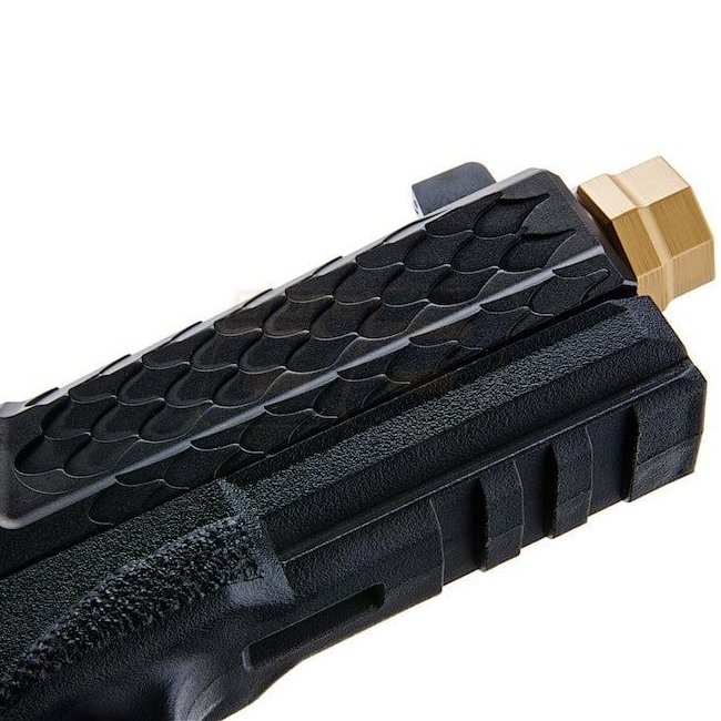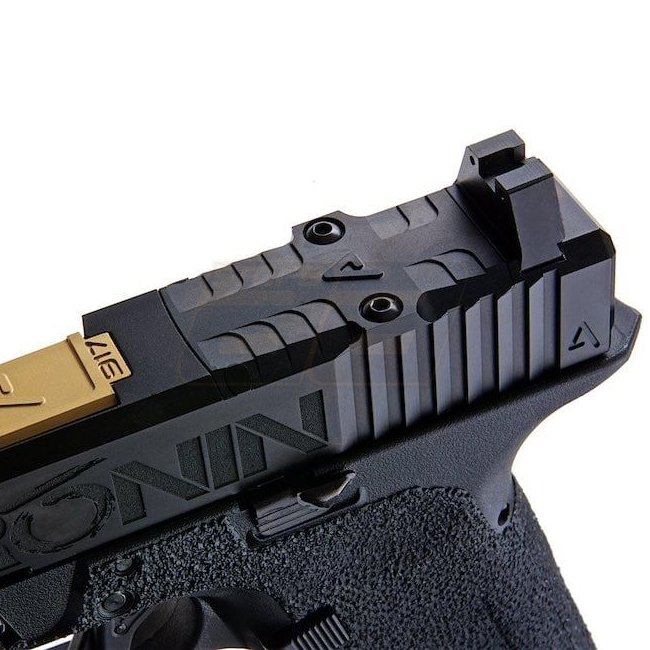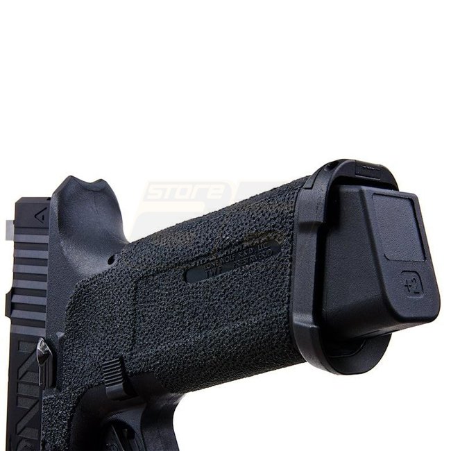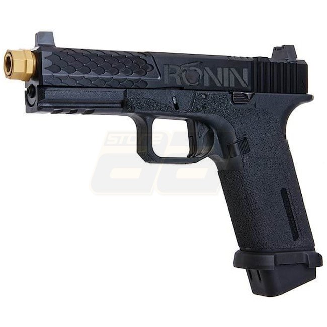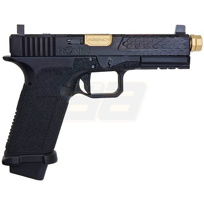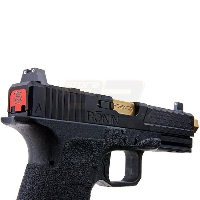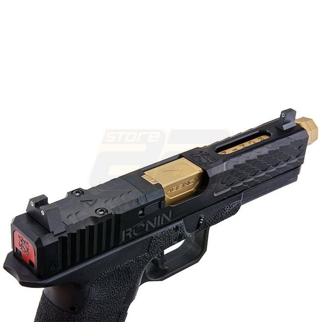 Pistolet à gaz blow back RWA Agency Arms Ronin - Métal/Polymère, capacité du chargeur de 23 balles, longueur de 240 mm, poids de 690 g, canon intérieur de 85 mm, 300-320 FPS, semi-automatique, portée de tir de 41,16 à 43,90 m. Hop-up réglable inclus.