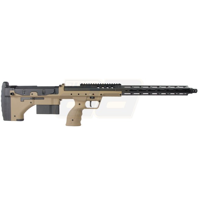 Fusil de sniper haute performance Silverback Desert Tech SRS A2/M2 avec configuration pour gaucher et couleur terre sombre. Design de crosse en métal/nylon de première qualité. Capacité de chargeur de 25 coups, longueur de 880 mm et poids de 2800 g. Équip