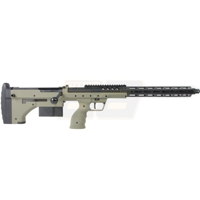 Fusil de sniper airsoft à ressort de haute qualité Silverback Desert Tech SRS A2/M2 22 pouces pour droitier - Olive. Vient avec un chargeur de 25 billes (6mm), une longueur de 880mm, et un poids de 2800g. Dispose d'un canon interne de 560mm, et d'un filet