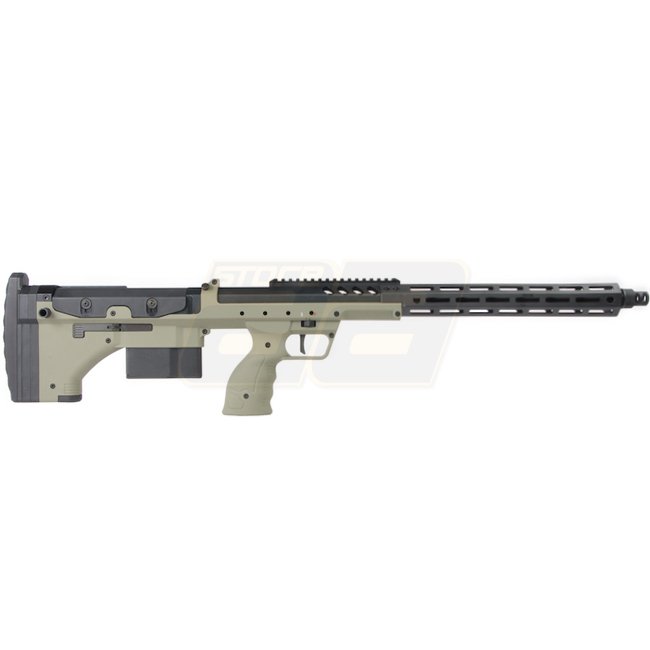 Le Silverback Desert Tech SRS A2/M2 présente un design pour gaucher en Olive, avec un canon de 22 pouces. Système à ressort, crosse en métal/nylon, chargeur de 25 coups, longueur de 880 mm et poids de 2800 g. Longueur du canon intérieur de 560 mm avec un