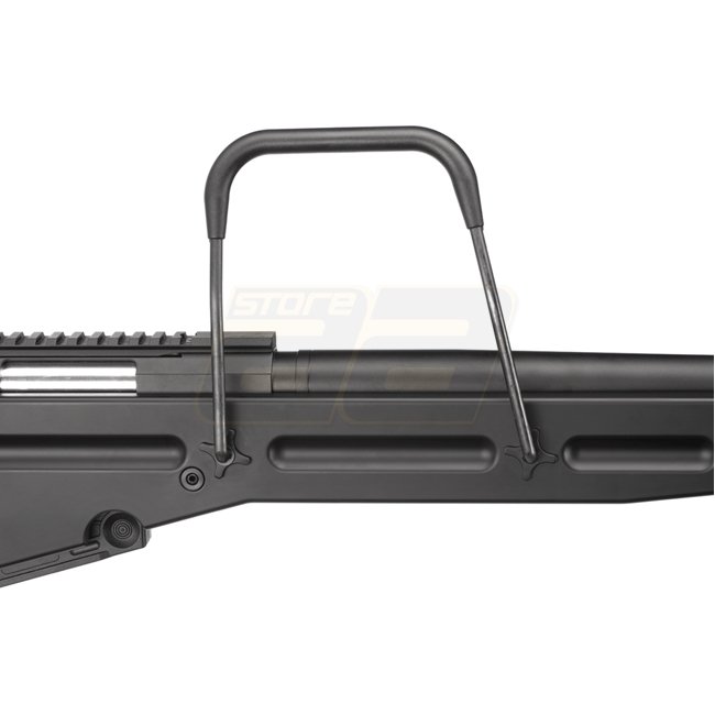 Fusil de Sniper à Ressort Snow Wolf SV98 - Noir est un fusil de sniper puissant et précis avec une crosse en métal et en polymère, capacité de chargeur de 65 cartouches, et une portée de tir allant jusqu'à 59,68 m. Le paquet comprend le fusil et le charge