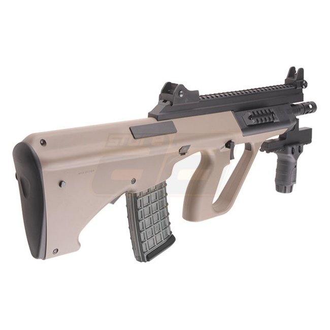Snow Wolf SW-020T AEG - Tan. Récepteur en métal, crosse en polymère et prise en main de pistolet. Capacité du chargeur de 330 billes. Modes de tir semi-automatique et automatique. Vitesse de bouche de 380-400 FPS. Hop-up réglable. Batterie avec prise Tami