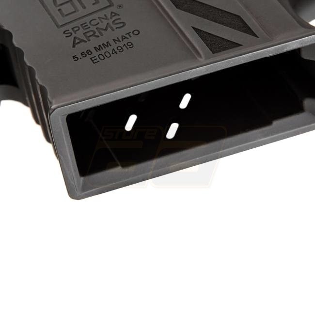 Les modèles de la E-série Specna Arms EDGE sont livrée avec une boîtier en metal nano-enduit. À l'intérieur, une "ORION“ gearbox robuste garantit fiabilité et flexibilité, car ils sont équipées d’un système de changement de ressort rapide "ESA". Grâce à cela, la performance peut être modifiées en quelques étapes simples. De plus, dans la gearbox est déjà installé un mosfet GATE X-ASR. Les pièces intégrées permettent l'utilisation de ressorts de différentes résistances (jusqu'à M140). Le canon intérieur de 6.03mm combiné avec une HopUp Unit de précision rotative assure la précision nécessaire. En plus du ressort intégré en usine, Specna Arms fournit un ressort M90 supplémentaire, ce qui peut réduire la performance de l'AEG à env. 310 FPS.