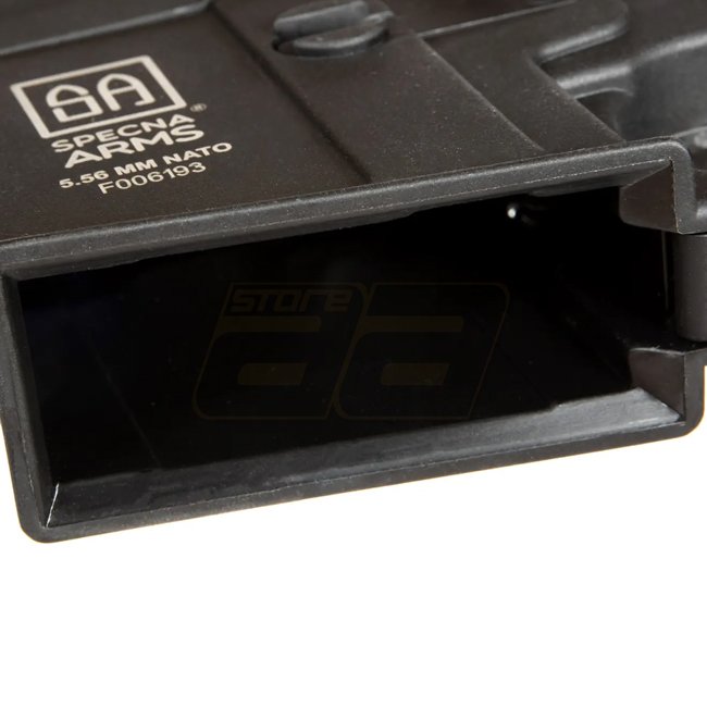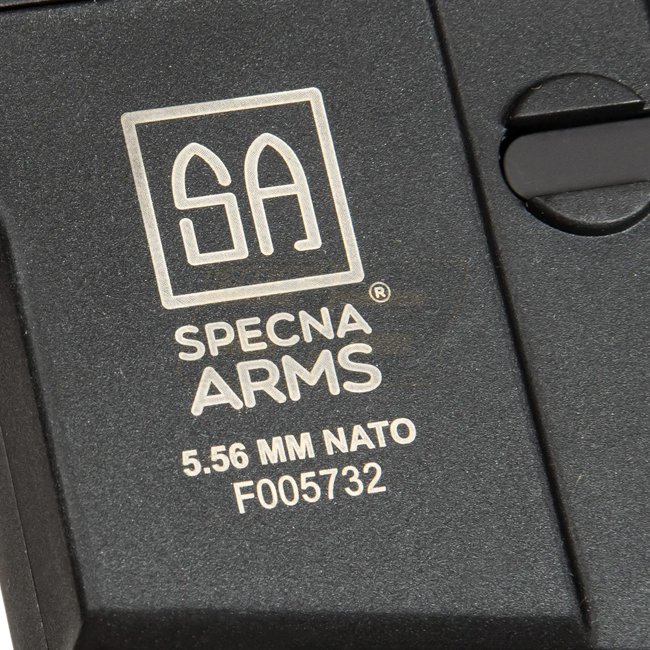 Le logement, le tube de crosse avec la crosse agrandie de type SF abritant la batterie, ainsi que la face avant au standard M-LOK et la poignée pistolet sont en plastique polymère renforcé de fibre de nylon. D'autres composants, tels que le canon, le cache-flamme et la poignée de rechargement élargie sont en métal (toutes les vis, goupilles, le volet d'éjection du boîtier et le boulon factice sont en acier). Il y a des marquages et un numéro de série sur le récepteur. En plus du ressort intégré en usine, Specna Arms fournit un ressort M90 supplémentaire, ce qui peut réduire la performance de l'AEG à env. 310 FPS.