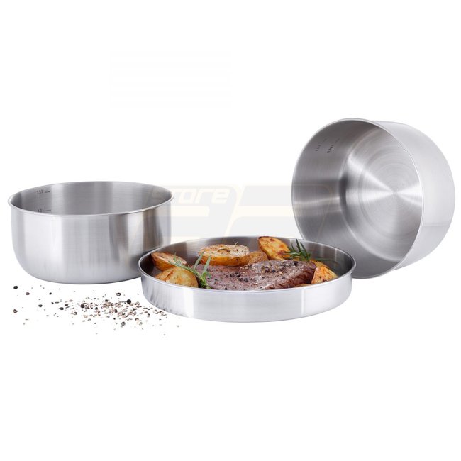 Le Multi Pot Set est un équipement de base pratique pour la cuisine extérieure. L'ensemble de cuisine de camping en acier inoxydable se compose de deux casseroles et d'une casserole. Cela peut également être utilisé comme couvercle de pot ou assiette.