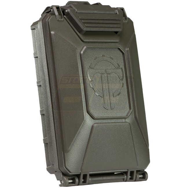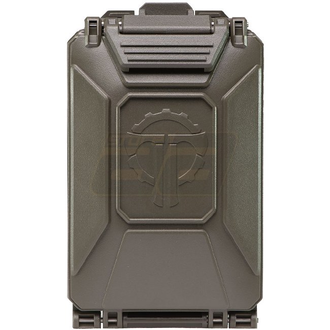 THYRM CellVault-5M Rangement modulaire pour batteries - Olive, construction en polymère étanche et durable, avec inserts modulaires pour différentes tailles de batteries. Loquet verrouillable, sangles d'attache MOLLE, et taille compacte. Dimensions : 16,5