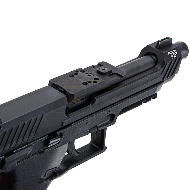 Extérieurement, le pistolet comporte un canon fileté CCW de 14 mm pour toutes les pièces jointes de bouche telles que les traceurs et les suppresseurs, une plaque optique RMR pour les solutions de points rouges et Picatinny sous les rails pour différents accessoires tels qu'une lampe de poche ou un laser, tout cela rend ce pistolet tout à fait modulaire. Disons qu'avoir un point rouge sur votre pistolet Airsoft n'est pas votre truc, ce pistolet a aussi des viseurs en fer à fibre optique.