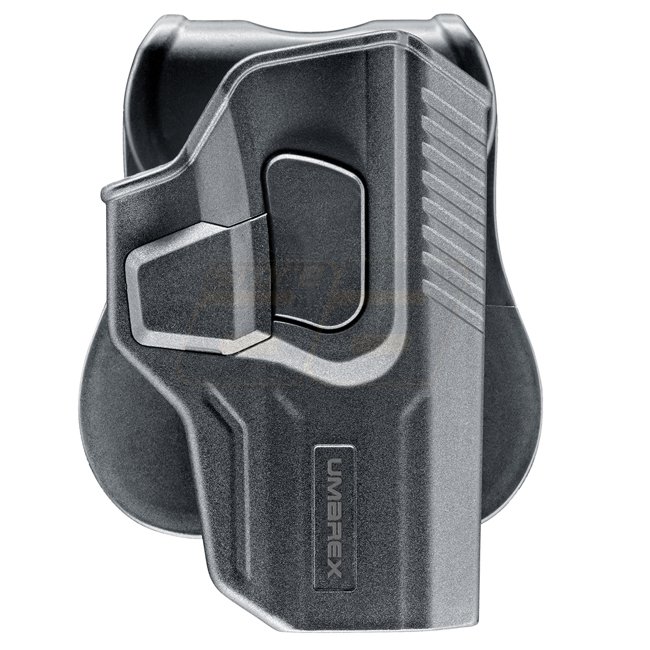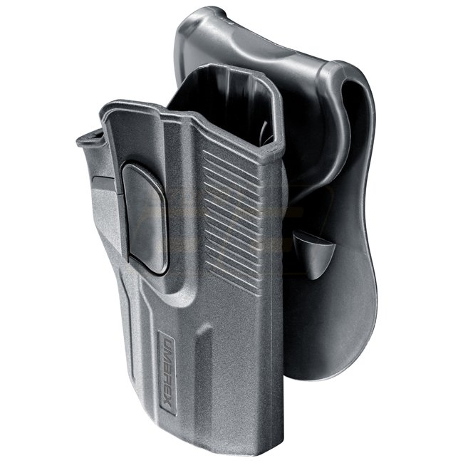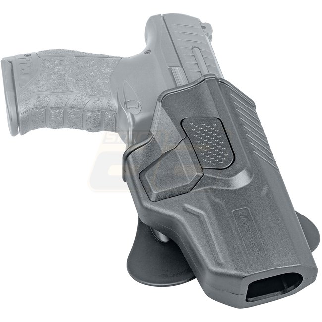 Holster en polymère réglable à 360° pour Walther PPQ et pistolet à gaz Umarex P99. Dispose d'un bouton de libération guidé par un ressort et d'un insert en caoutchouc sur la palette.
