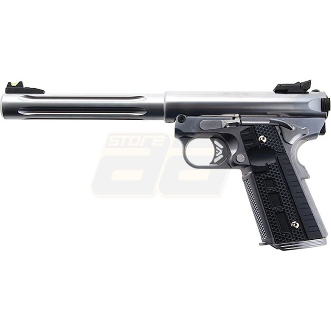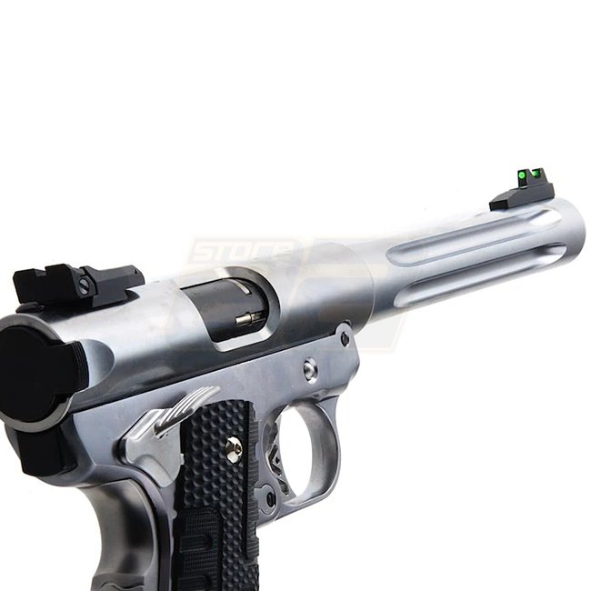 Un pistolet à gaz blow back premium de couleur argent avec une construction en métal et en polymère. Présente un chargeur de 15 cartouches, une longueur de 285 mm, un poids de 1040 g, un canon interne de 115 mm, un mode de tir en Semi-Auto, un hop-up régl