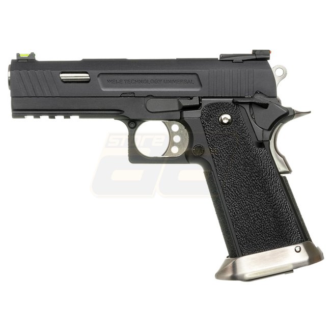 Pistolet à gaz blowback WE Hi-Capa 4.3 Allosaurus - Noir, glissière en métal, poignée en plastique, capacité du chargeur de 31 coups, longueur de 202 mm, poids de 990 g, canon interne de 97 mm, vitesse à la bouche de 290-310 FPS, mode de tir semi-automati