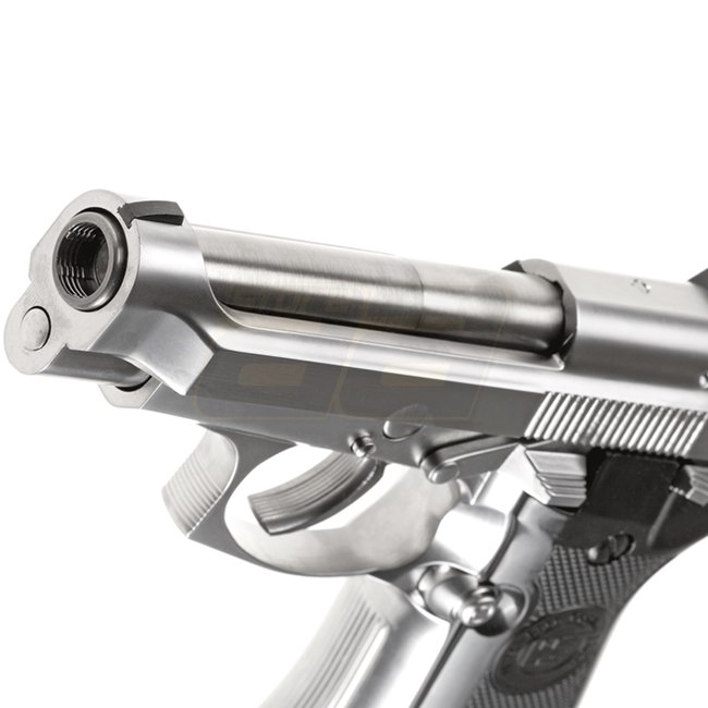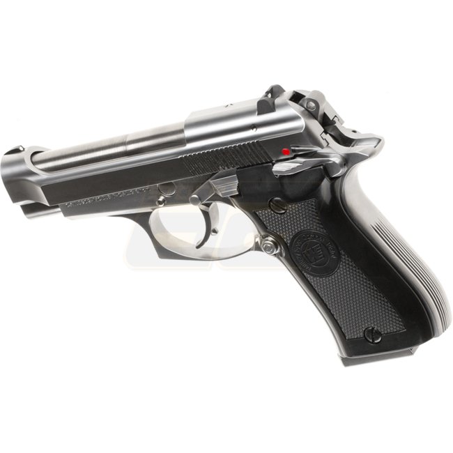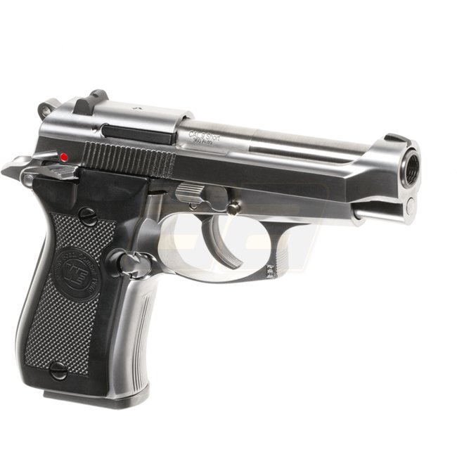 Pistolet à Gaz Blow Back WE M84 - Argent : Métal / Polymère, chargeur de 17 cartouches, longueur de 175mm, poids de 620g, canon interne de 75mm, vitesse de 280-300 FPS, mode Semi Auto, portée de tir de 38,41-41,16m, Hop Up réglable. Le paquet comprend le