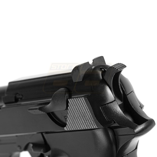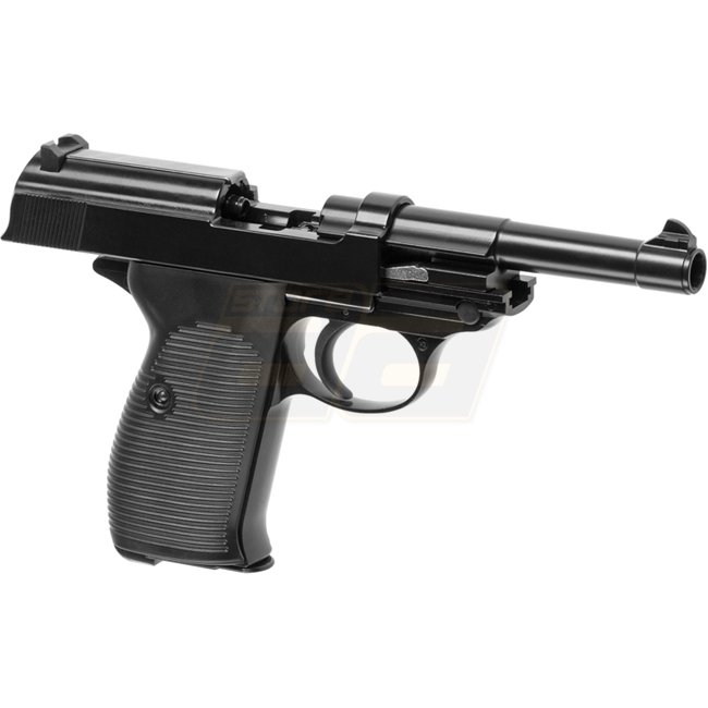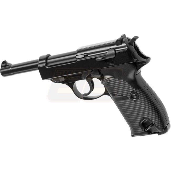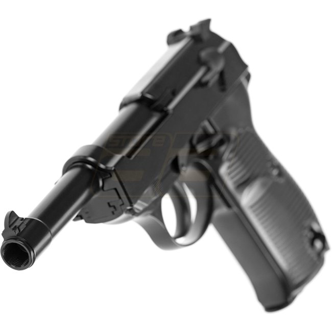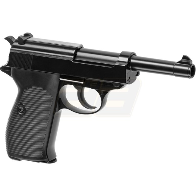 Pistolet à Gaz WE P38 Blow Back - Noir : Métal / Polymer, capacité du chargeur de 14 (6mm), longueur de 220mm, poids de 740g, longueur du canon interne de 110mm, vitesse de sortie de 290-310 FPS, mode de tir semi-automatique, portée de tir de 39.79-42.53m