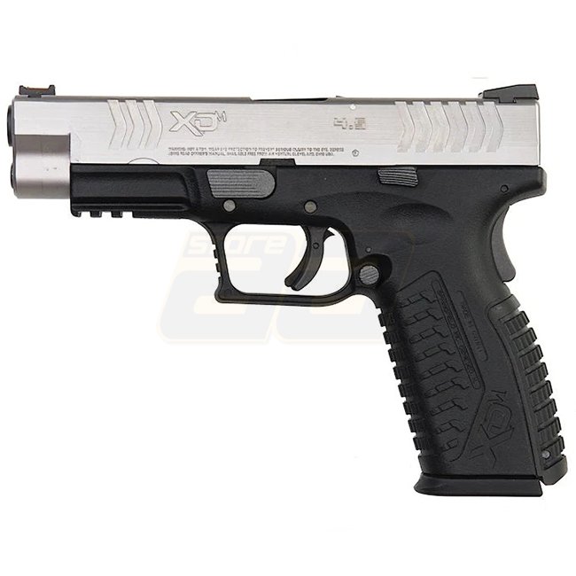 Pistolet WE Springfield Armory XDM 4.5 à gaz avec recul - Argent, fabriqué en Métal / Polycarbonate, avec une capacité de magazine de 25 (6 mm), longueur de 210 mm, poids de 844 g, mode de tir - Semi-Automatique, Hop Up réglable. Le paquet comprend le pis