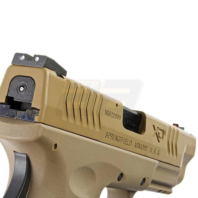 Pistolet à gaz blowback WE Springfield Armory XDM 4.5 de couleur tan, avec construction en métal et en polymère, capacité de chargeur de 25 cartouches, longueur de 210 mm, poids de 844 g et portée de tir allant jusqu'à 48,02 m. Parfait pour le tir semi-au