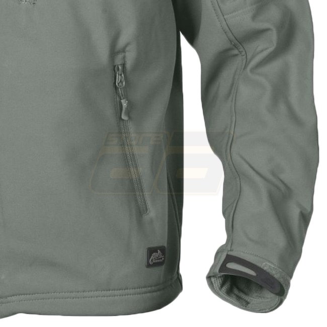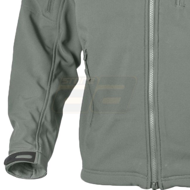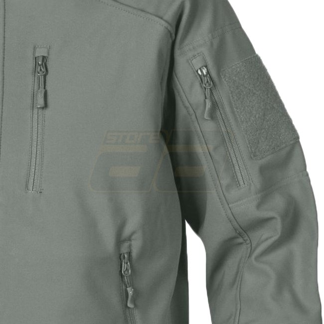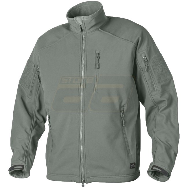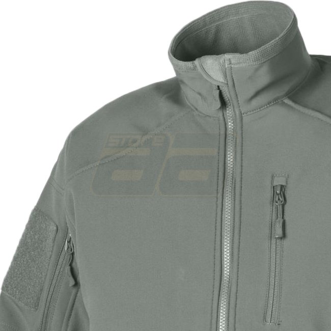 This lightweight soft shell layer in Foliage Green is a versatile jacket for temperate weather. Fast drying with DuPont Teflon coating for breathability. Features stand-up collar, YKK zipper, internal and outer pockets, reinforced elbows, and adjustable c