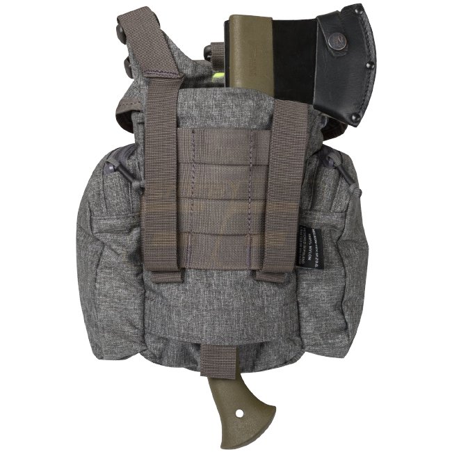 The Essential Kitbag® was designed to hold all bushcraft/survival essentials. This bag can hold a water bottle with cup, folding stove, flashlight, compass, cord, sewing kit etc. all neatly organized in separate pockets. On the back is a sleeve that will hold a folding saw, knife or an axe and extra pouches can be attached at the front side via MOLLE. The Essential Kit Bag can be carried attached to backpack or belt via MOLLE/PALS or with its own shoulder strap.