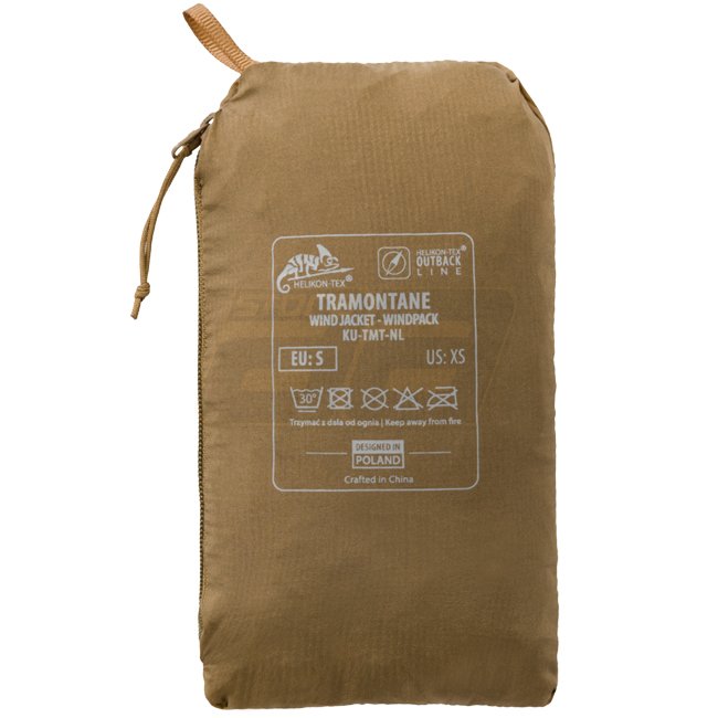 The Helikon-Tex Tramontane Wind Jacket in Coyote color is an ultra-light windproof layer, weighing only 120 g. It fits in a selfpack pocket and features an adjustable hood. Made of durable WindPack Nylon with DWR impregnation for light rain or snow protec