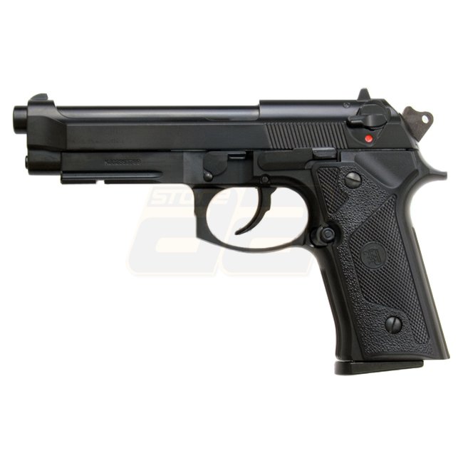 KJ Works M9 Vertec Gas Blow Back Pistol: Metal / plastic grip cover, 25 round magazine, 217mm length, 875g weight, 112mm inner barrel, 300-320 FPS velocity, Semi Auto shooting mode, Adjustable Hop Up. Includes gun and magazine.