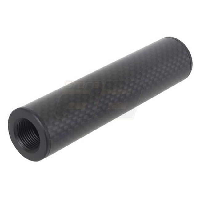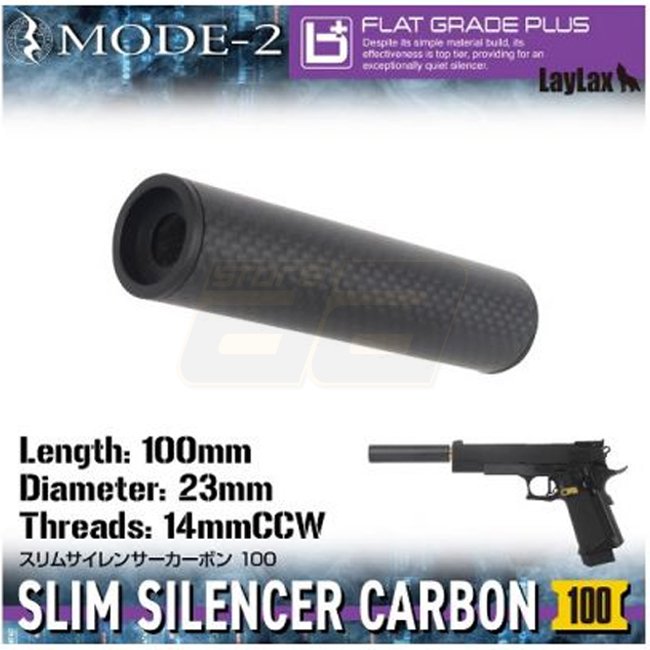 Laylax MODE-2 Carbon Fiber Slim Silencer 14mm CCW 100mm - Black is a high-quality firearm attachment designed to reduce noise and enhance the overall appearance of your weapon. Made of durable carbon fiber material, this silencer is sleek, lightweight, an