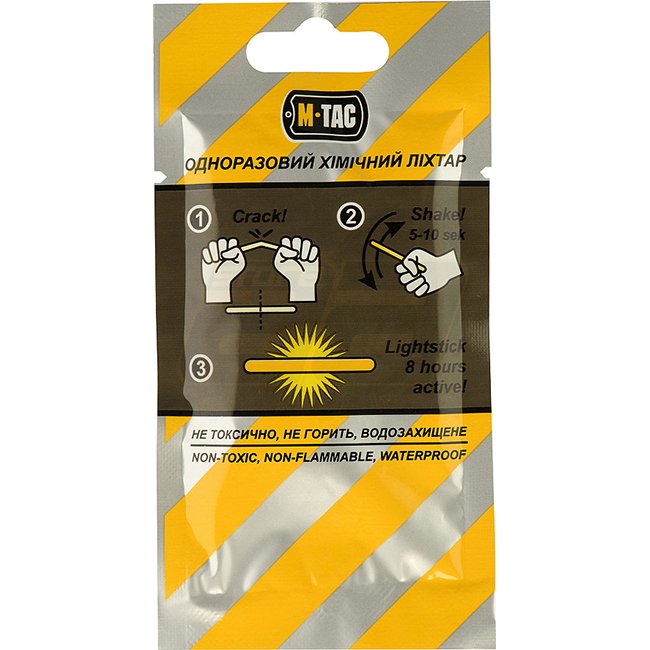 The M-Tac glow stick is a completely self-contained light source that works without electricity and helps to illuminate dark places, mark a point or give a signal. The disposable tube can illuminate a small area for 24 hours after activation. Safe, non-toxic, and non-flammable chemical components are contained in a sealed case and can be stored for a long time without losing their properties. It is widely used in military practice, diving, and is also used as various kinds of backup lighting.