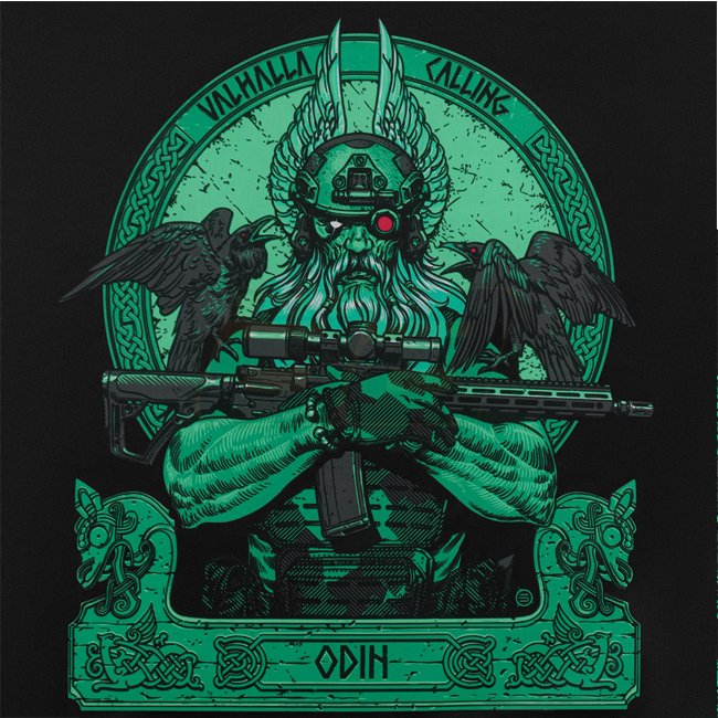 The print depicts a determined Odin who has swapped his traditional spear (Gungnir) for an AR-15 rifle. Dressed in modern combat gear and an NVD helmet, he is ready to lead his warriors into the final battle. On Odin's shoulders sit his faithful companions - the ravens Hugin (thoughts) and Munin (memory), who fly around the 9 worlds every day and report to the supreme god about everything that has happened.