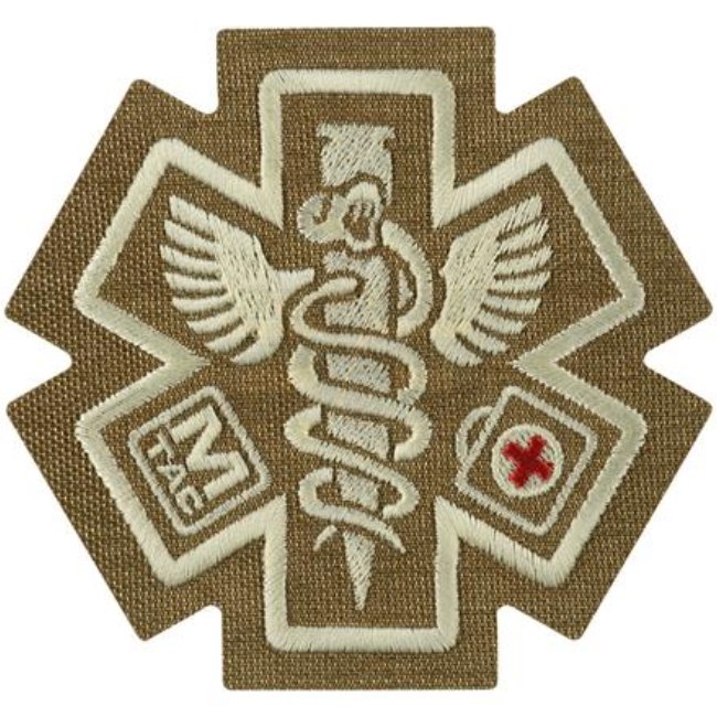M-Tac Paramedic Embroidery Patch - Coyote, made of Cordura 500D on the front and featuring a hook surface on the back. Sized at 75 x 80 mm.