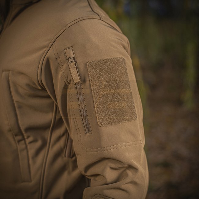 M-Tac Soft Shell Jacket in Tan. Weatherproof with interlayer polyurethane membrane. Features a thin fleece layer. Lightweight and versatile with outer layer for wind protection and inner layer for insulation. Moisture and dirt deflecting fabric for comfor