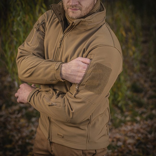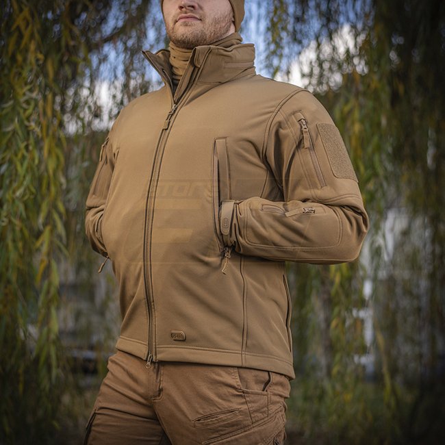 M-Tac Soft Shell Jacket - Tan - XS: High-quality soft shell jacket made of polyurethane membrane for protection from bad weather. Features a thin fleece layer inside for added warmth. Lightweight, dual-layer construction offers both wind and weather prote
