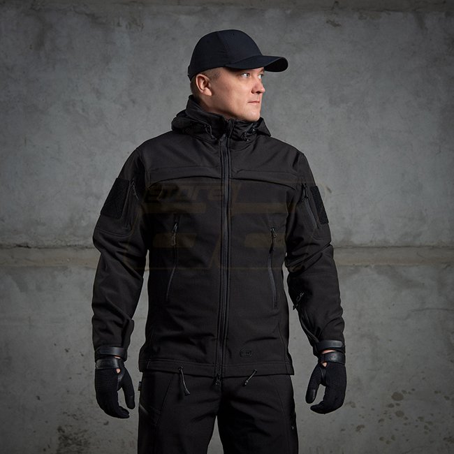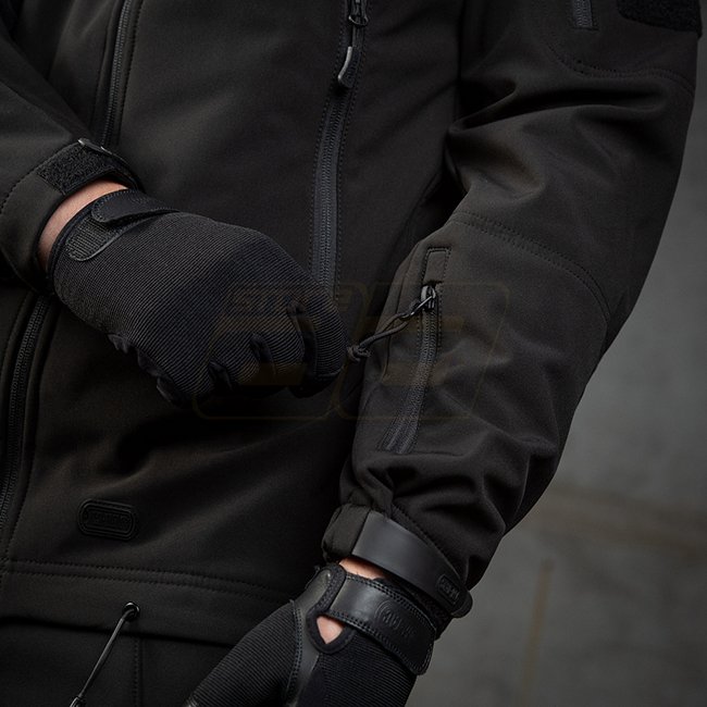 M-Tac Soft Shell Police Jacket in Black - S. Waterproof jacket with fleece layer, identification panels, and side arm access. Lightweight and versatile.