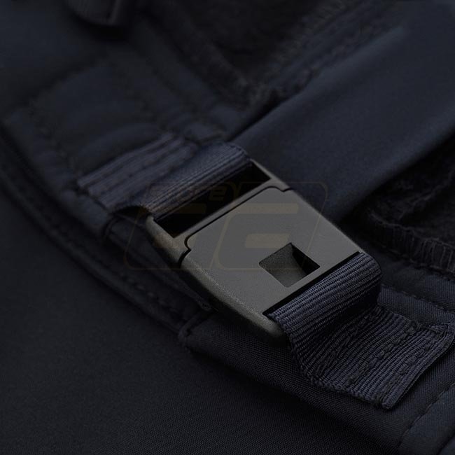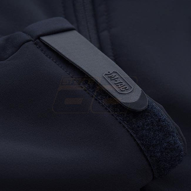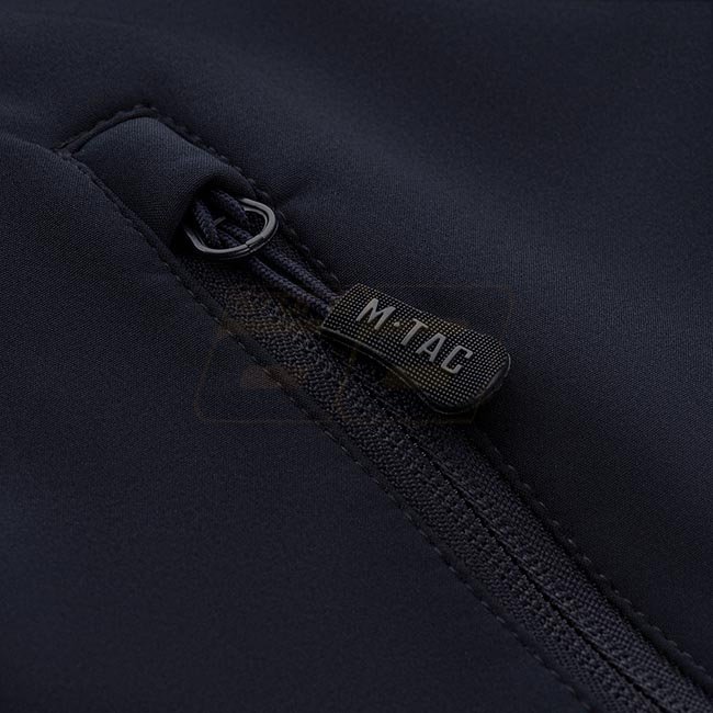 The M-Tac Soft Shell Police Jacket in Navy Blue size L provides protection from bad weather with an interlayer polyurethane membrane and a thin fleece layer. Features identification panels for customization and quick access to a side arm. Lightweight, wit