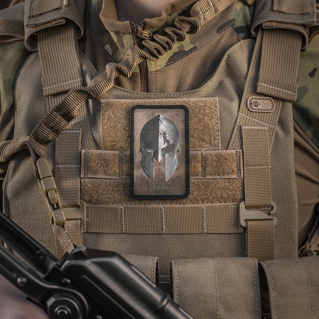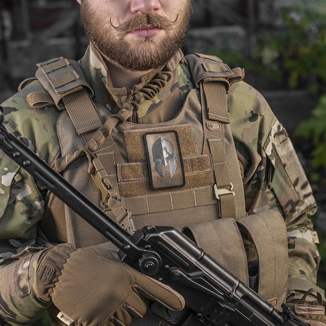 M-Tac Spartan Helmet Print Patch - Coyote. Front: Cordura 500D Nylon, Back: Hook surface. Dimensions: 45 x 87 mm.