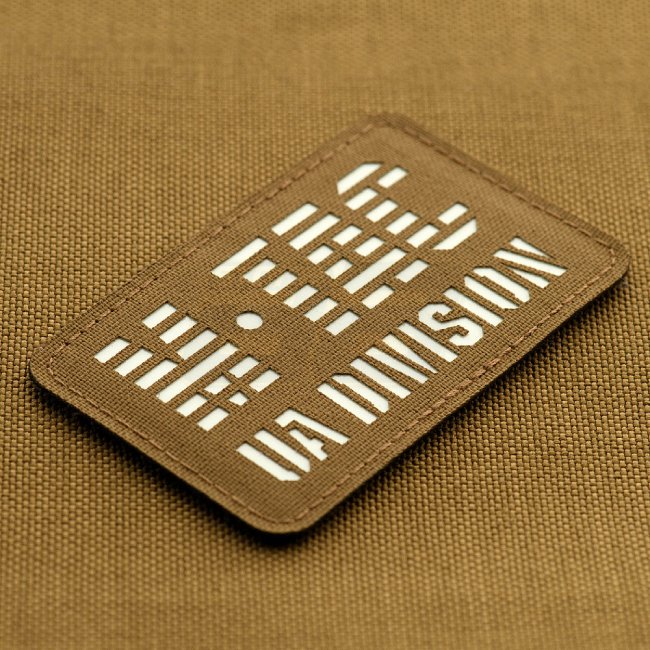 M-Tac UA Division Laser Cut Patch GID - Coyote, 80x50 mm, Cordura 500D front, hook surface back. High visibility in low light conditions.