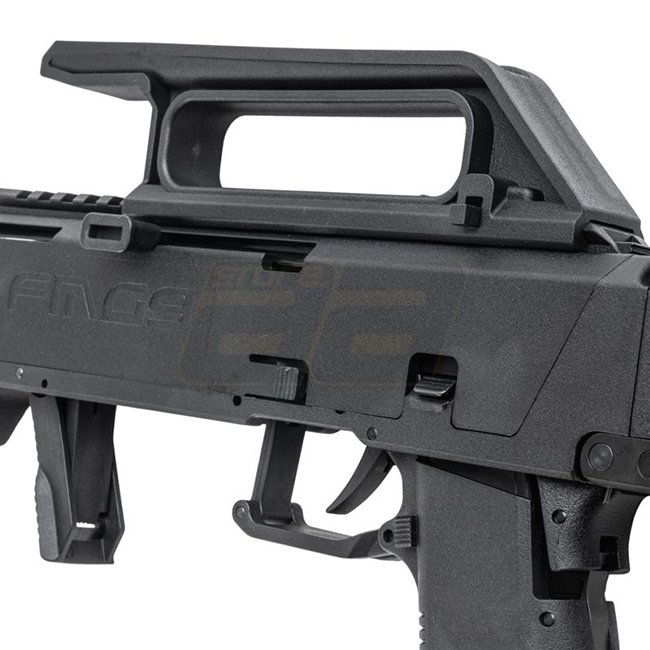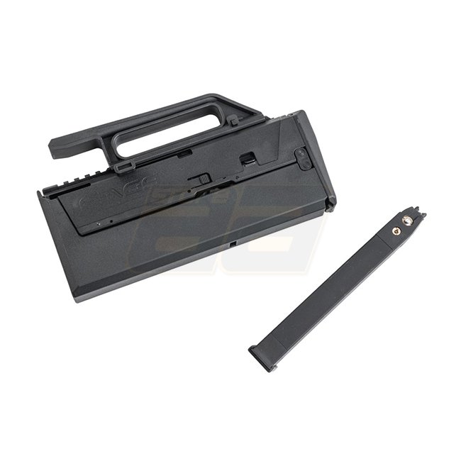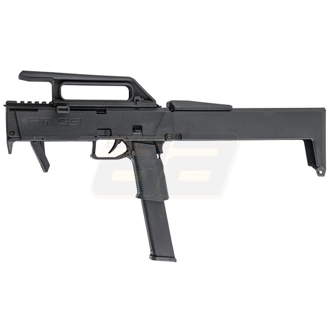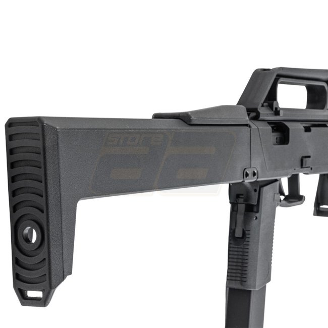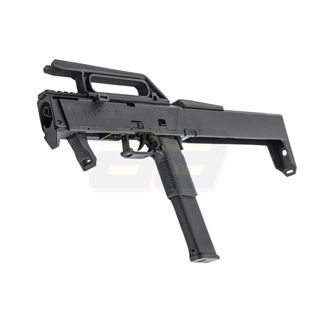 Vollständiges GBB-System des Prototyp-Falt-SMG, ausgelegt als flaches, leicht verstaubares SMG-Plattformdesign. Durch leichtes Betätigen des Ladehebels klappt die Waffe auf und ist einsatzbereit.