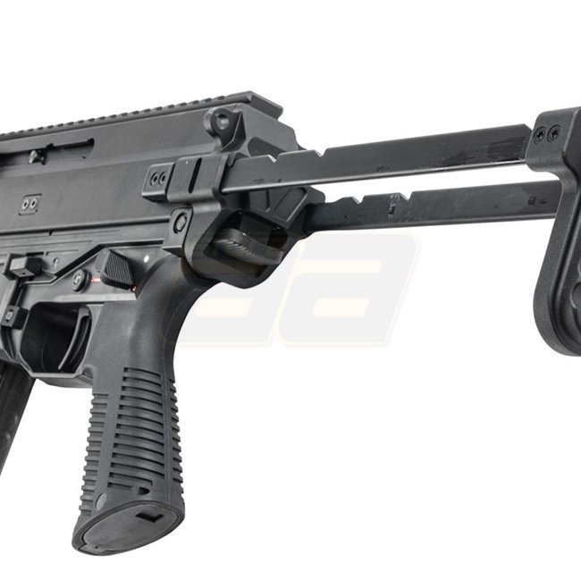 Kompaktes SMG Gas-Blowback-System in Straight-Mag-Konfiguration. Die Pro-G-Version bietet einen einstellbaren, teleskopischen PDW/Schaftaufbau, einen quad-Picatinny-Handguard und einen integralen, tracer-ready Mündungsaufsatz mit Tri-lug QD.