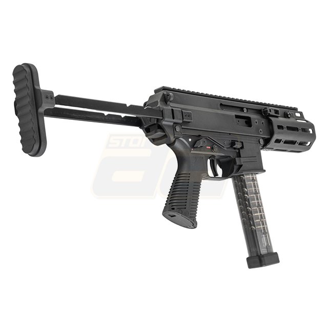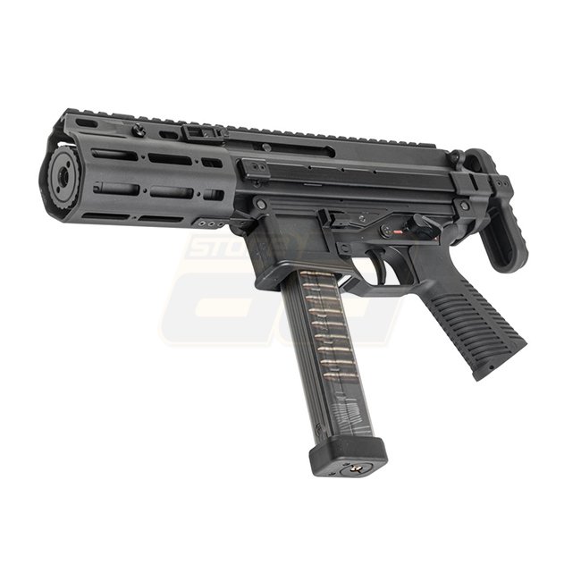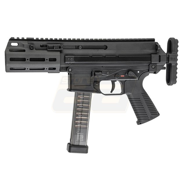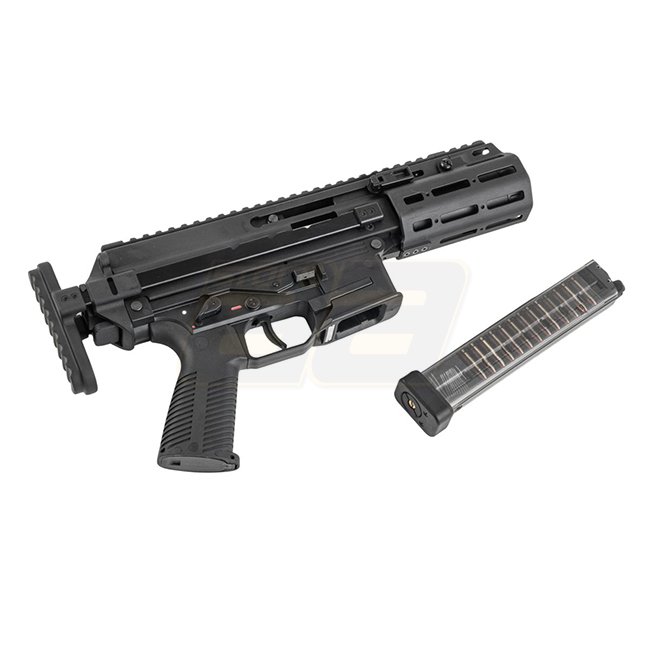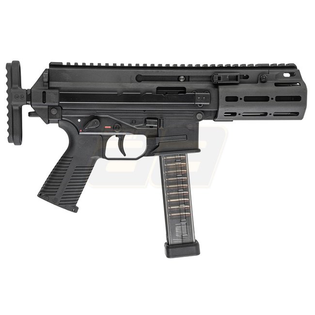 Ultra-compact SMG gas blowback system in a straight-mag configuration. SD2 internally suppressed platform with a hybrid M-LOK/Picatinny handguard and a 3-position telescopic stock.