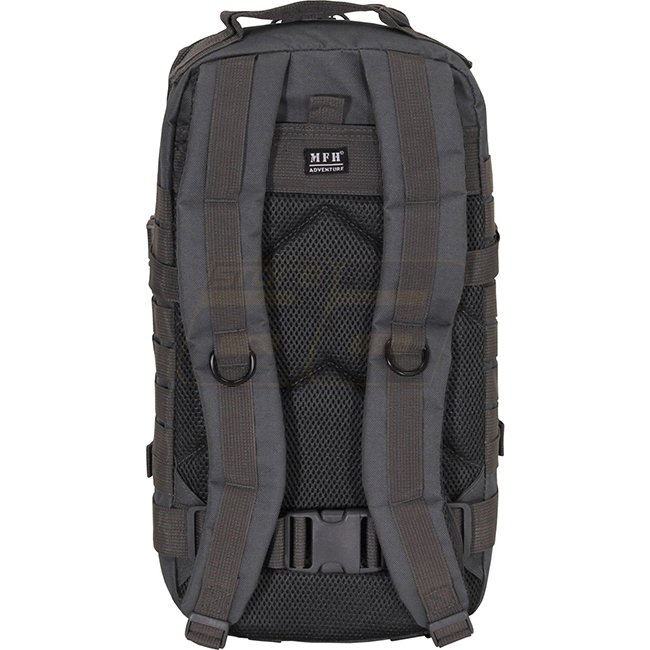 MFH Backpack Assault 1 Basic - Grey: Adjustable, padded shoulder straps, detachable waist strap, hydration pack compartment, breathable mesh padding. 30L capacity, 23x44x24cm dimensions, 950g. 100% Polyester.